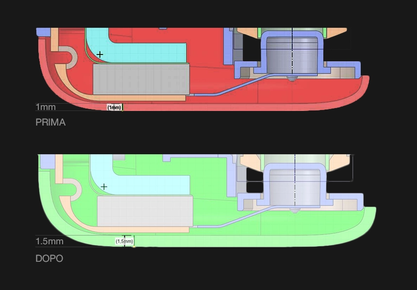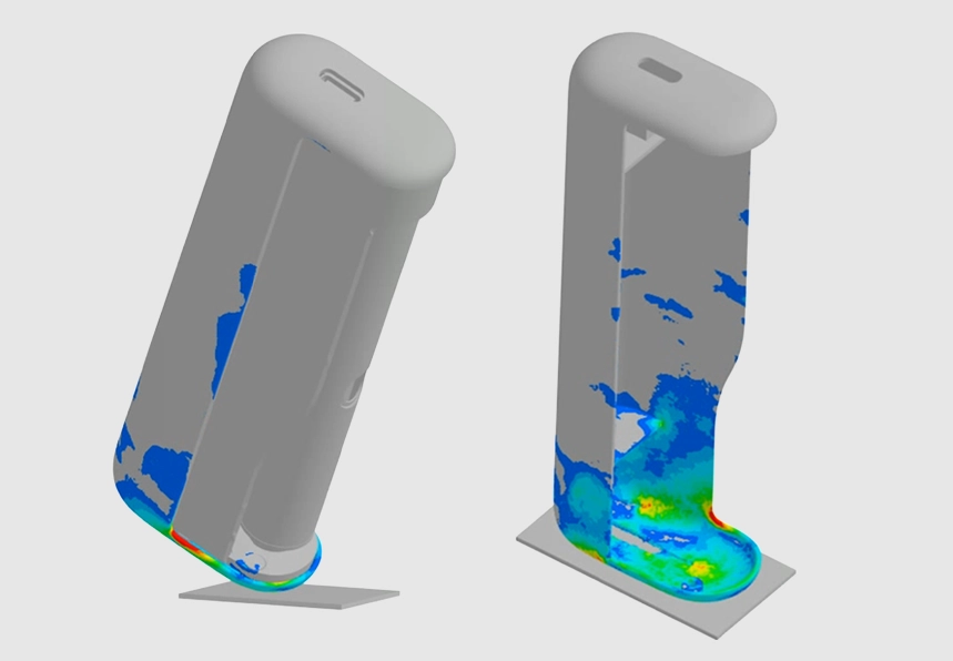 Le prime simulazioni di drop test dell'IQOS hanno immediatamente evidenziato i punti deboli del design originale, localizzando con precisione le aree a maggior rischio di cedimento, come le fessure per l'aria e specifiche zone di impatto frontale. Questa profonda analisi di caduta ha permesso di comprendere le dinamiche di rottura. Il vero valore aggiunto dell'approccio di Asotech è stata la capacità di eseguire rapidamente ed economicamente decine di iterazioni di design virtuali, testando alternative come l'aumento dello spessore delle pareti, la modifica del posizionamento dei fori, l'introduzione di nervature di rinforzo e l'ottimizzazione dei raggi di raccordo. I test fisici condotti da Philip Morris su prototipi hanno successivamente confermato l'elevata accuratezza dei modelli di simulazione, incluse le previsioni sulle deformazioni (~2.5 mm), consolidando la fiducia nel processo di ottimizzazione del design dell'IQOS guidato dalla simulazione.